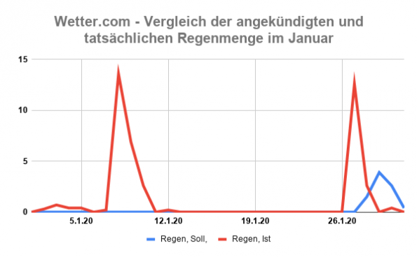 Die ersten ergiebigen Niederschlagsmengen vom 8. bis 10. Januar sah man überhaupt nicht kommen. Etwas besser lief es bei der zweiten Serie von verregneten Tagen. Diese passierten am 27. und 28. Januar. Wetter.com verschätzte sich grob bei der Niederschlagsmenge. Und war bei der zeitlichen Einordnung ein wenig zu vorschnell.