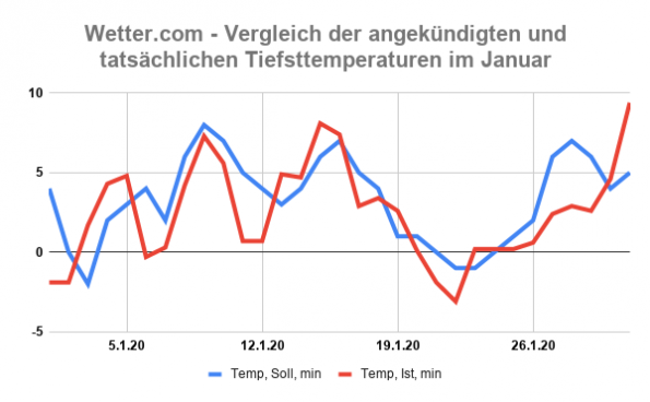 Auch hier steht die blaue Linie für die angekündigte Temperatur, und die rote Linie für die tatsächliche Tagestiefstemperatur.