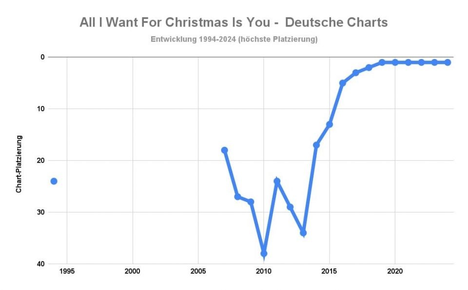 Als Mariah Carey vor 30 Jahren All I Want For Christmas is you veröffentlichte, sah es nicht danach aus, als ob der Single großen Erfolg beschieden sein würde. Ja, es war eine schwungvolle Nummer, die es bis auf Platz zwei in Großbritannien brachte. Das war es dann aber auch schon. In Deutschland kam das Weihnachtslied 1994 nicht einmal in die Top Twenty. Bei Platz 24 ging dem Song die Puste aus.