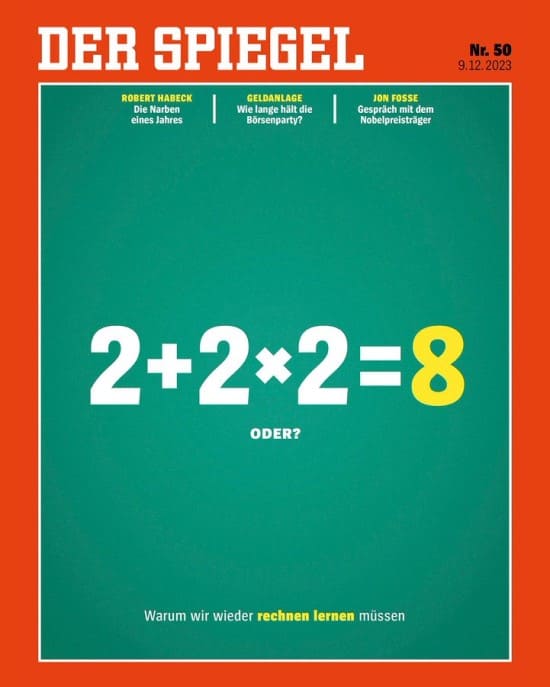 Das aktuelle Spiegelcover beschäftigt sich mit dem erneuten katastrophalen Abschneiden der deutschen Schulen bei der Pisa-Studie. Das Titelbild kommt sehr minimalistisch rüber. Es zeigt lediglich die Gleichung 2 + 2 x 2 = 8 Und eine Zeile darunter, deutlich kleiner Oder? Nun, je nachdem, wie gut man die Rechenregeln kennt, gelangt man entweder zu der Überzeugung, die richtige Antwort sei 6, beziehungsweise 8.
