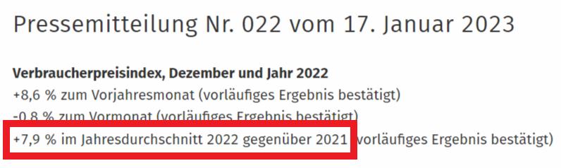 +7,9% lag also die mittlere Inflationsrate für 2022 nach Meinung vom Statistischen Bundesamt von Mitte Januar.
