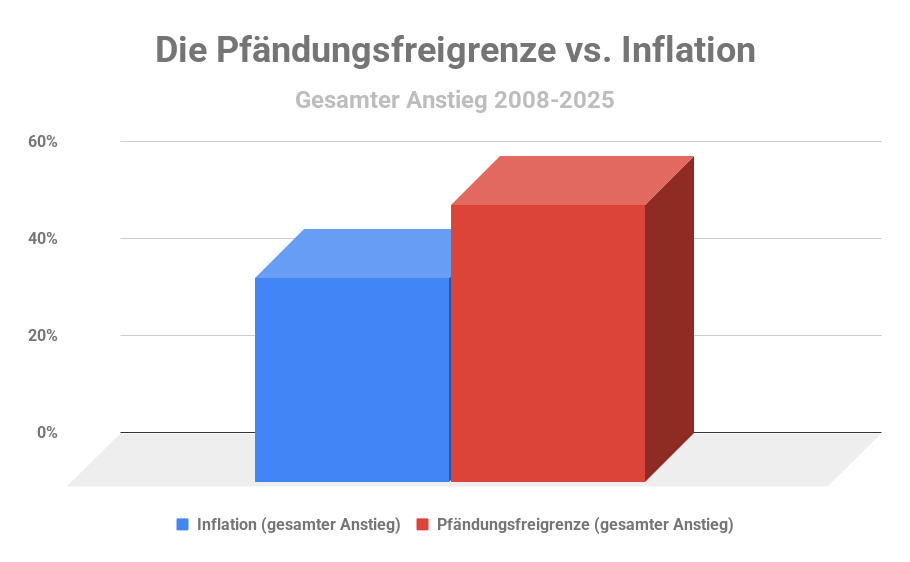Wie entwickelte sich der unpfändbare Freibetrag für einen Single ohne Rind & Kind im Vergleich zur gesamten Inflation? Nun, hier ist der Chart: