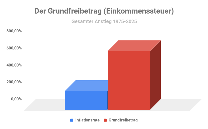Wir landen beim Freibetrag mittlerweile bei einem Anstieg von 690 % (was einem Multiplikator von 7,9 entspricht). Von den anfänglichen 1550 € (bzw. 3032 DM) aus dem Jahr 1975 losgehend, sind wir inzwischen bei 12.348 € angekommen. Die offizielle (Gesamt-)Inflationsrate erhöhte sich dagegen gerade einmal um 221 %.