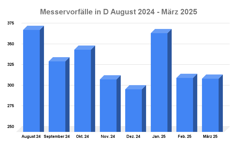 Die tragischen Messerattacken der letzten Zeit wie z. B. in Solingen und Aschaffenburg haben sich ins kollektive Gedächtnis gebrannt. Aber wie sieht es bei der Gesamtheit aller Messervorfälle aus? Also inkludiert auch jener mittelschwerer Vorfälle, bei denen Personen nur verletzt wurden. Und die Vielzahl aller kleineren Delikte. Wie das Mitführen einer (verbotenen) Waffe außerhalb der eigenen Wohnung, zum Beispiel eines Dolches, das bloße Bedrohen mit einem Messer oder auch das Tragen eines eigentlich erlaubten Messers in einer Waffenverbotszone.