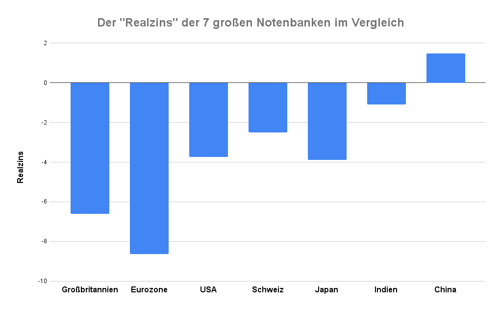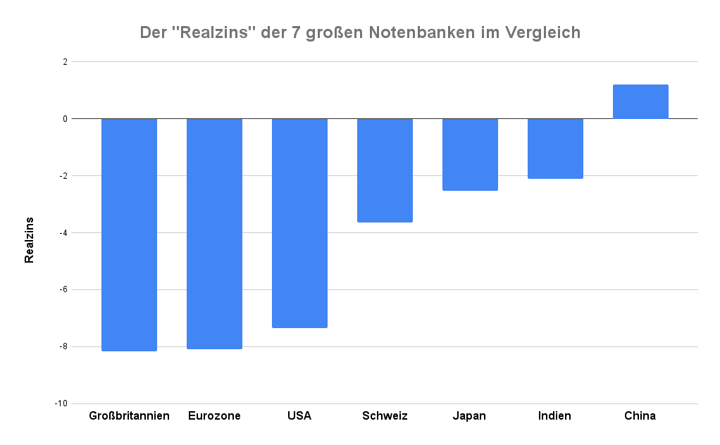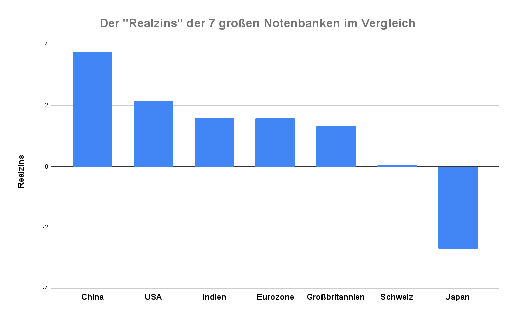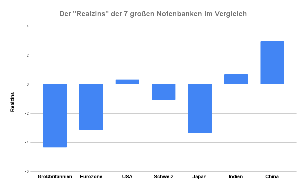 Wie aber schlagen sich beim „Realzins“, also Inflation minus Leitzins die anderen großen Notenbanken?