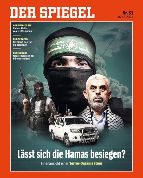 Das aktuelle Spiegel-Cover zeigt vor einem düsteren grauen Hintergrund mit Rauch- und Staubwolken einige Kämpfer der Hamas. Selbstbewusst halten sie Ihre Kalaschnikows in die Höhe. Zusätzlich fügte der Illustrator noch groß den verhüllten Kopf eines weiteren Kämpfers ein. Der schaut dem Leser ruhig und selbstbewusst direkt zurück in die Augen. Lässt sich die Hamas besiegen? Lautet der Titel