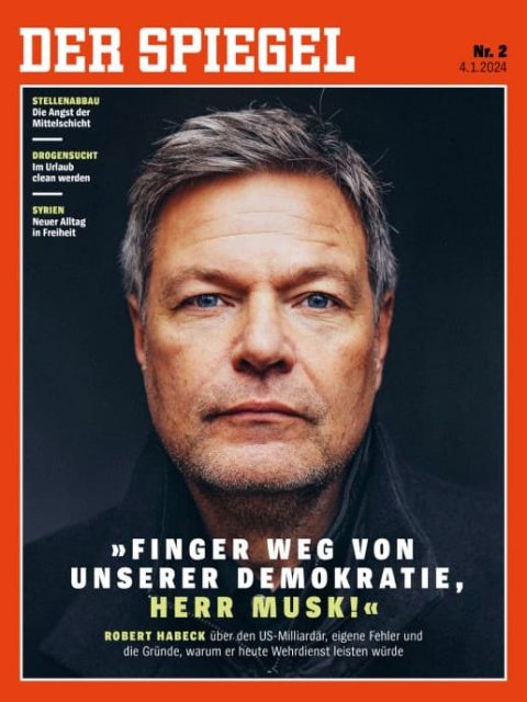 Das aktuelle Spiegelcover zeigt inzwischen zum 11. mal Robert Habeck. Wie so häufig seit ungefähr einem halben Jahrzehnt bringt der Spiegel großflächig das Gesicht eines Politikers vor dunklem Hintergrund. „Finger weg von unserer Demokratie, Herr Musk!“ lautet der Titel.