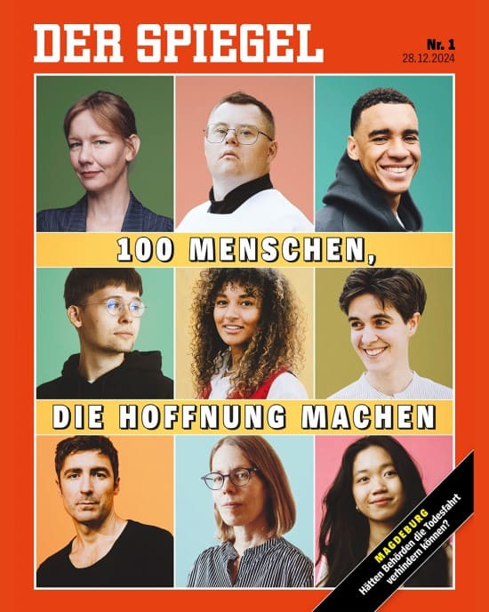 Das aktuelle Spiegel-Titelbild zeigt ein 3 x 3 Raster von Gesichtern, deren Geschichten Mut machen sollen. 100 Menschen, die Hoffnung machen, lautet der Titel. Warum dann trotzdem nur neun Gesichter gezeigt werden, bleibt das Geheimnis des Illustrators. Schließlich gibt es auch Spiegel-Cover (siehe rechts), mit weit mehr als 100 Profilaufnahmen.