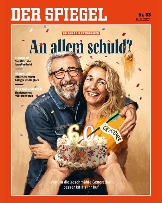 Das aktuelle Spiegelcover zeigt ein etwa 60 Jahre altes Paar, welche, sich umarmend, breit grinsend auf eine Person außerhalb des Bilds schauen. Diese reicht ihnen eine kleine Geburtstagstorte mit der Aufschrift „60“. Das passt allerdings nicht so richtig, denn gemeinhin umfasst die Generation Boomer die Geburtsjahre ca. 1946 bis 1964. Die Torte passt also tatsächlich eher zur nachfolgenden Generation X. Wie auch immer, der Titel lautet an allem schuld?