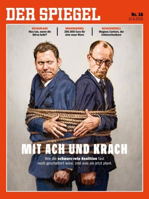 Das aktuelle Spiegelcover zeigt eine Karikatur der beiden Parteivorsitzenden Friedrich Merz und Lars Klingbeil. Aneinander gefesselt versuchen sie sich die Hände zu reichen. Zumindest eine Hand jeweils. Die andere ist zur Faust geballt. Beide im blauen Anzug samt Krawatte wirken sie dabei wie siamesischer Zwillinge.