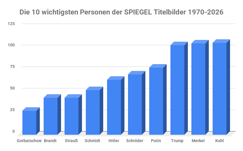 Fun Fact am Rande: Trump führt inzwischen mit riesigem Abstand. Er erscheint öfter auf dem Cover als der zweitplatzierte, der dritte und der vierte zusammen. Die Datenreihe beginnt mit meinem Geburtsjahr: 1970. Nixon, der arme Kerl, hat dadurch vermutlich einige SPIEGEL Titelbilder verloren. Und nun ohne Einschränkung zu den