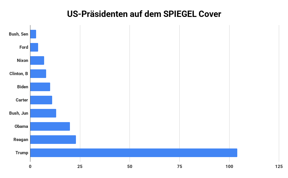 Vor gerade einmal 7 Jahren tauchte Trump das erste Mal auf den SPIEGEL Titelbilder auf. Seitdem platzierte ihn die Redaktion des SPIEGEL mehr als 90-mal auf dem Cover. Trump belegt so in der Nischen-Liste der Präsidenten der Vereinigten Staaten bereits jetzt den ersten Platz! Reagan und Obama, die hinter ihm liegen, kamen dagegen auf die vollen 8 Jahre, die ein US-Präsident maximal haben kann.