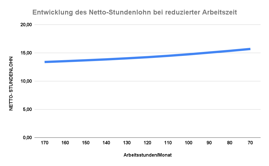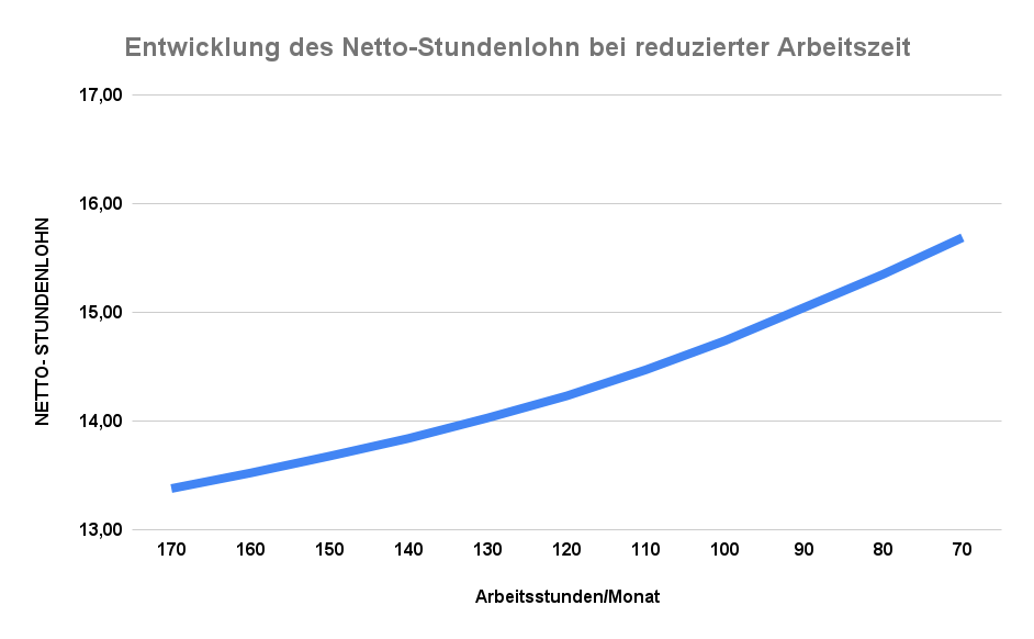 Das sieht ziemlich dramatisch aus, oder? Tatsächlich steigt der netto-Stundenlohn von 13,38 bei 170 Stunden im Monat auf 15,69 bei 70 h/Monat. Ist das viel? Das kommt natürlich darauf an, wie nötig man das Geld braucht. Wenn man genügend finanzielle Freiheit hat, steigt so plötzlich der Stundenlohn um 17 % an.