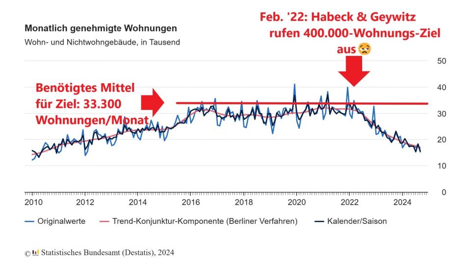 Nun verhält es sich mit Baugenehmigungen und tatsächlich gebauten Wohnungen so ein bisschen wie mit Soll-Werten und Ist-Werten. Es gibt immer einen Schwund. Doch selbst auf Sollwert-Basis ist Habecks und Geywitz Projekt ein einziges Fiasko. Wir rechnen zunächst mal das Jahresziel von 400.000 Wohnungen auf ein monatliches Mittel um. Wir kommen da auf 33.300 Wohneinheiten.