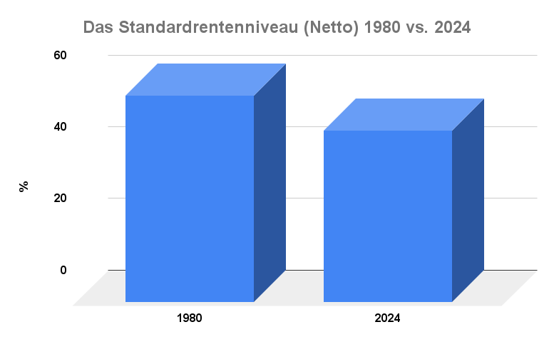 Das Standardrentenniveau lag 1980 bei 57,6 %. 44 Jahre später ist es auf 48,0 % gesunken. Was im übrigen auch das absolute Minimum in der Zeitreihe seit 1970 ist😞. Ein Neurentner mit Standardrente, der heute in Rente geht, hat also knapp 10 % gegenüber seinem Pendant aus den 80ern verloren.