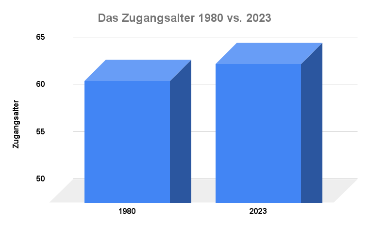 Auch beim Renteneintrittsalter mussten Neurentner über die letzten knapp 4 Jahrzehnte Federn lassen. Das Zugangsalter lag 1980 für Männer und Frauen bei 62,6 Jahre. Bis 2023 stieg es um 1,8 Jahre auf 64,4 an.
