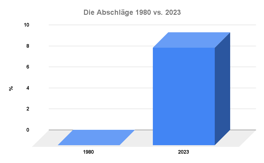 Da die Abschläge erst 1996 eingeführt wurden, lag ihre Gesamthöhe 1980 bei 0,0. Die Sache sah 2023 schon anders aus. Rentner mussten hier durchschnittliche Abschläge in der Gesamthöhe von 9,3% ihrer Rentenanwartschaft hinnehmen. (Was bedeutet, sie gingen im Schnitt 31 Monate vor ihrem regulären gesetzlichen Renteneintritt in Frührente)