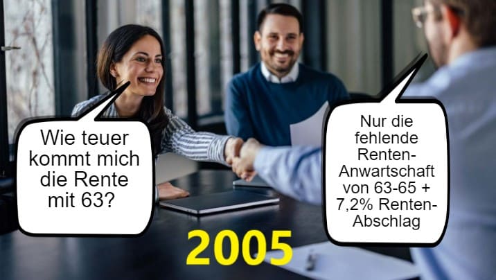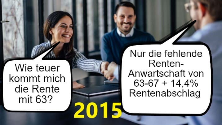 Bundestag und Bundesrat beschlossen 2007 das Gesetz zur Anpassung der Regelaltersrente an die demografische Entwicklung und zur Stärkung der Finanzierungsgrundlagen der gesetzlichen Rentenversicherung. Um einen langen Text kurz zusammenzufassen. Das gesetzliche Renteneintrittsalter wurde mit einer ewig langen Übergangszeit auf 67 angehoben. Unangenehmer Nebeneffekt bei der Geschichte: Die Abschläge für die Rente mit 63 haben sich so auf 14,4 % verdoppelt.