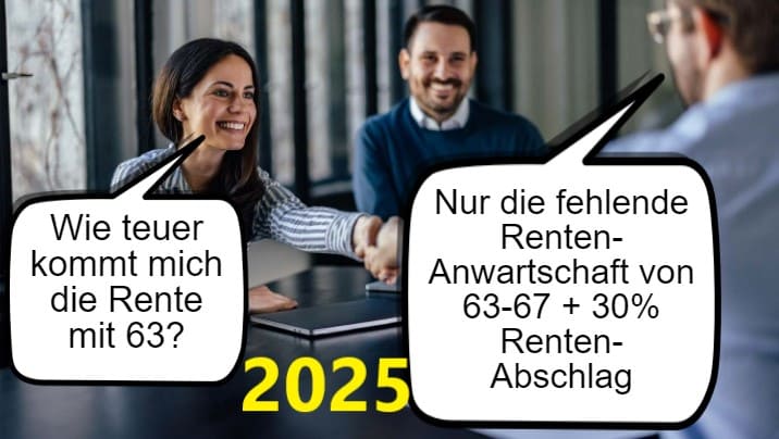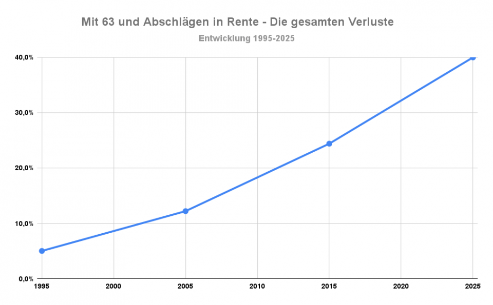 Das sieht nicht gut aus. Die Verluste einer vorgezogenen Rente mit 63 mit Abschlägen haben sich dramatisch die letzten 30 Jahre hinweg ausgeweitet. Sie liegen gegenüber einem gleich alten Kollegen, der brav bis 67 durcharbeitet, bei inzwischen 25 %. Und sehr wahrscheinlich werden sie ’25/26 auf ca. 40% ansteigen. Oder, um es positiver im Merz’schen Sinne auszudrücken: